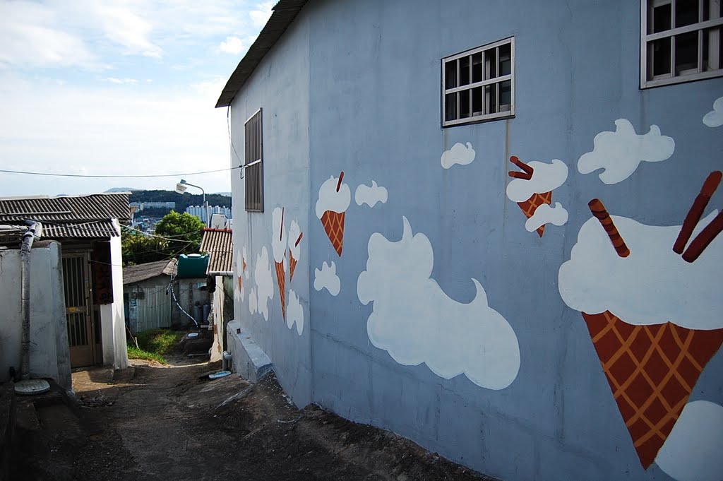 부산 문현동 안동네. 문현동 산 23-1번지 일대다. 문현동에서 전포동으로 넘어가는 전포고개 즈음에 자리 잡고 있다. 외지인들은 주로 돌산마을 또는 안동네라 부르고 마을에 사는 이들은 황령산 자락에 자리잡은 까닭에 황령마을이라고 부른다. 공식적으로는 안동네다. 안동네는 벽화마을로 유명해졌다. 지난해 3월 부산시가 공공미술 프로젝트를 진행했고 주민들과 학생, 시민 등 자원봉사자 230여명이 참여해3개월간 벽화 47점을 그렸다. 스산한 회색빛 골목은 화사한 파스텔톤의 아름다운 골목으로 다시 태어났다. 안동네는 ‘2008 대한민국 공공디자인대상’ 주거환경부문 최우수상을 수상하면서 명소로 떠올랐다. 어린이집 담벼락에 그려진 30m 길이의 그림 ‘시골마을 운동회 풍경’을 시작으로 재미있는 내용의 벽화가 이어진다. 주말이면 카메라를 맨 젊은이들의 발걸음이 줄을 잇는다.