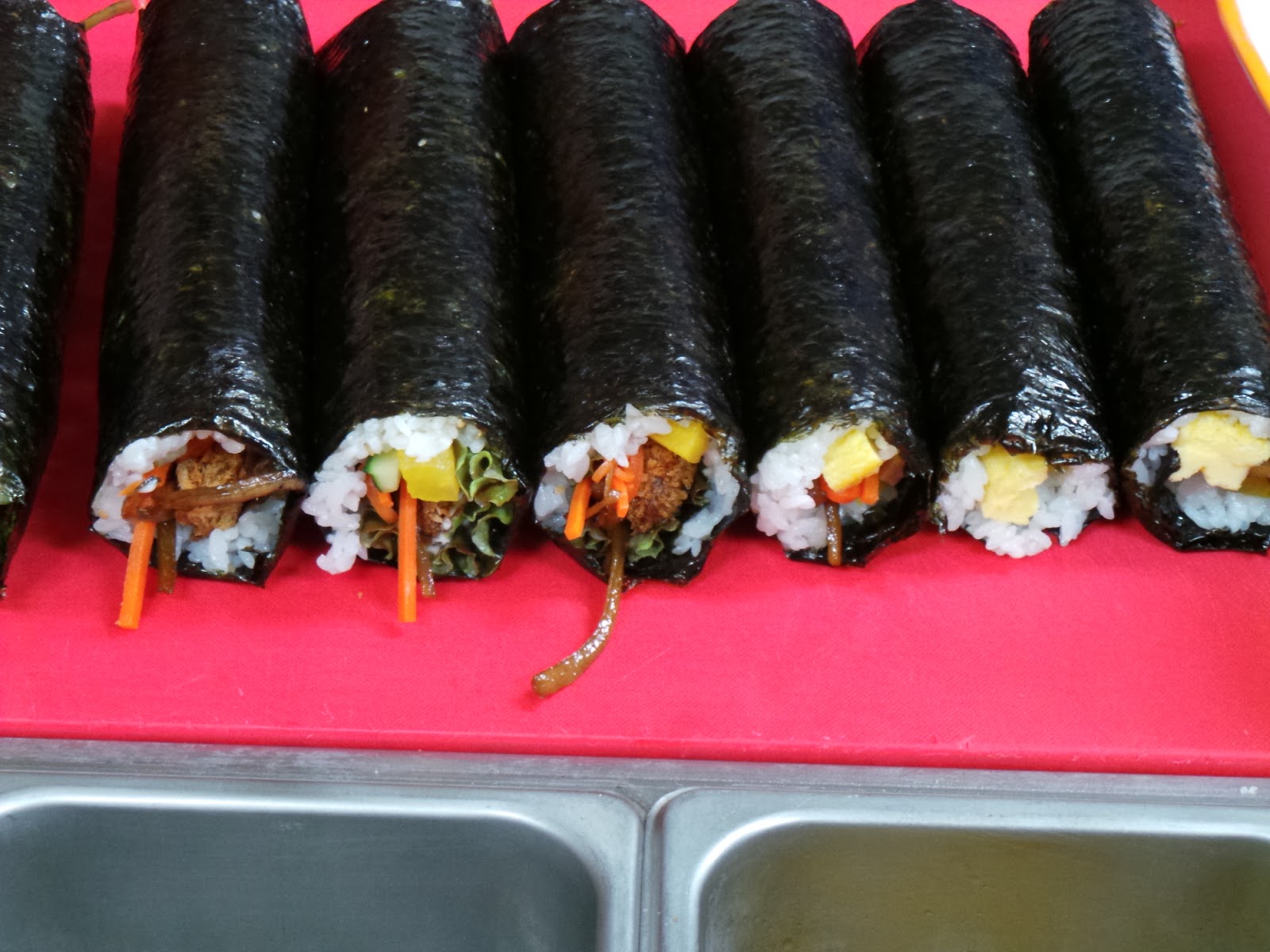 식당에서 김밥으로 배를 채우기로 했다. |